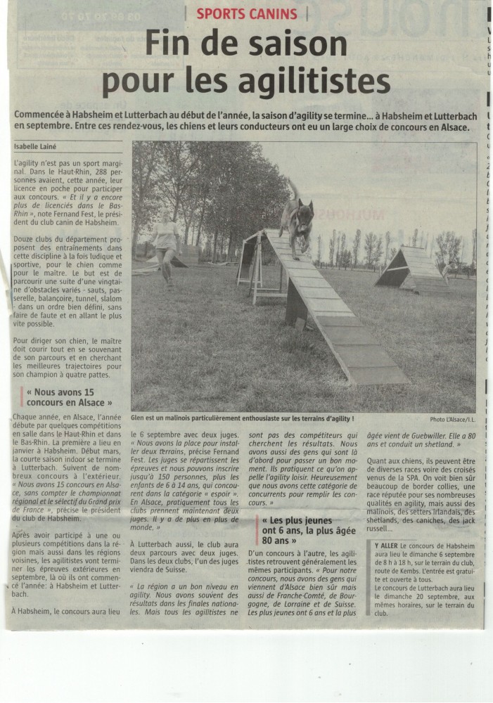 Ce dimanche 6 septembre : concours Agility sur le terrain : route de Kembs à Habsheim .
