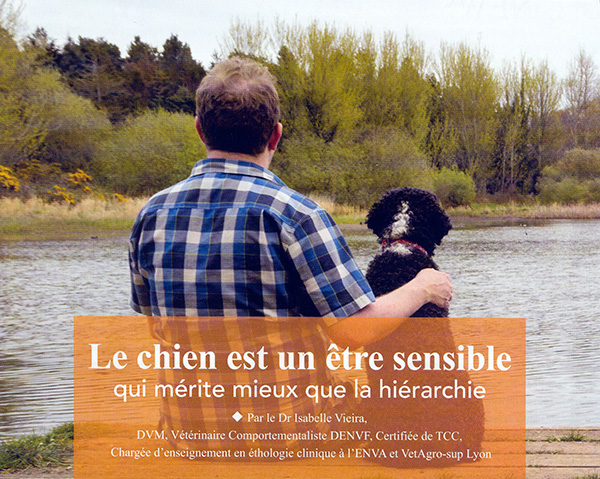 « Dans la plupart des cas, l’humain prend un chien dans un but soit d’utilité, soit de compagnie. Le chien est entré dans les familles comme un membre à part entière et il vient de lui être accordé son caractère « d’être sensible » par la loi. A l’opposé, pendant des décennies, il a été répété que le chien devait être dominé et subordonné à l’homme qui était impérativement le chef de meute. Cette notion de hiérarchie homme-chien a fait l’objet de nombreuses recherches en éthologie… »