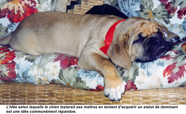 « De récentes thèses de recherche ont montré que les chiens qui dorment dans le lit des humains montrent moins d’agression envers ces humains que les chiens vivant avec une moindre proximité de leurs maîtres. Quand le chien s’installe dans le lit ou sur le canapé, il n’a pas l’intention d’acquérir un statut particulier et encore moins de montrer une quelconque dominance. Il me semble que ce terme est utilisé un peu partout de façon abusive pour exprimer un caractère affirmé, un statut de chef, une étiquette sociale ». L’auteur rappelle qu’en éthologie, le concept de dominant désigne un « individu gagnant à l’issue d’un conflit entre deux protagonistes ». Elle pense que « d’utiliser continuellement le terme de dominant pour désigner un chien qui grogne, qui chevauche ses maîtres, qui lève la patte dans la maison, qui réclame de la nourriture, qui accueille les invités et saute sur les gens, ou qui se couche dans les passages ou apporte ses jouets est une habitude qu’il est temps de savoir réviser. »