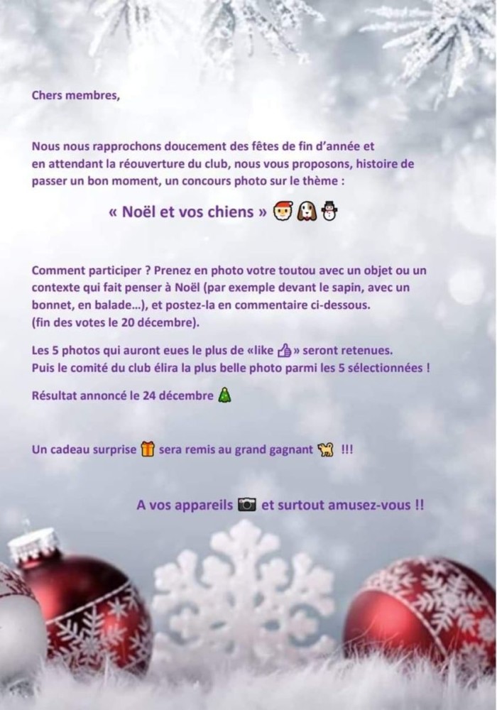 Chers membres! Nous mettons un petit concours FB en place pour rendre cette fin d’année 2020 plus gaie, à défaut de pouvoir nous rencontrer le dimanche matin sur le terrain pour travailler avec nos chiens, pour papoter et rire ensemble ….(Ca reviendra